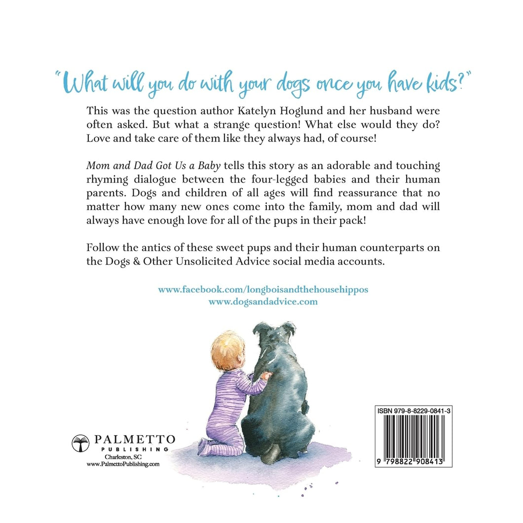 "What will you do with your dogs once you have kids?" This was the question author Katelyn Hoglund and her husband were often asked. But what a strange question! What else would they do? Love and take care of them like they always had, of course! Mom and Dad Got Us a Baby tells this story as an adorable and touching dialogue between the four-legged babies and their human parents. With vibrant, multicolored illustrations and catchy lyrical language, this story will engage the hearts and imaginations of children age 2 and up while teaching them that animal babies and human babies are very much alike despite appearances and both are very much loved by their parents.